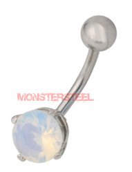 Semi precious stone belly ring. This beautiful stone navel ring features a prong-set semi precious stone designed with a surgical steel curved barbell.. Specifications: 14 Gauge (1.6mm), 7/16" (11mm), 316L Surgical Grade Stainless Steel, Semi Precious Stone, 5mm Ball. Semi Precious Stone Opal Belly Ring